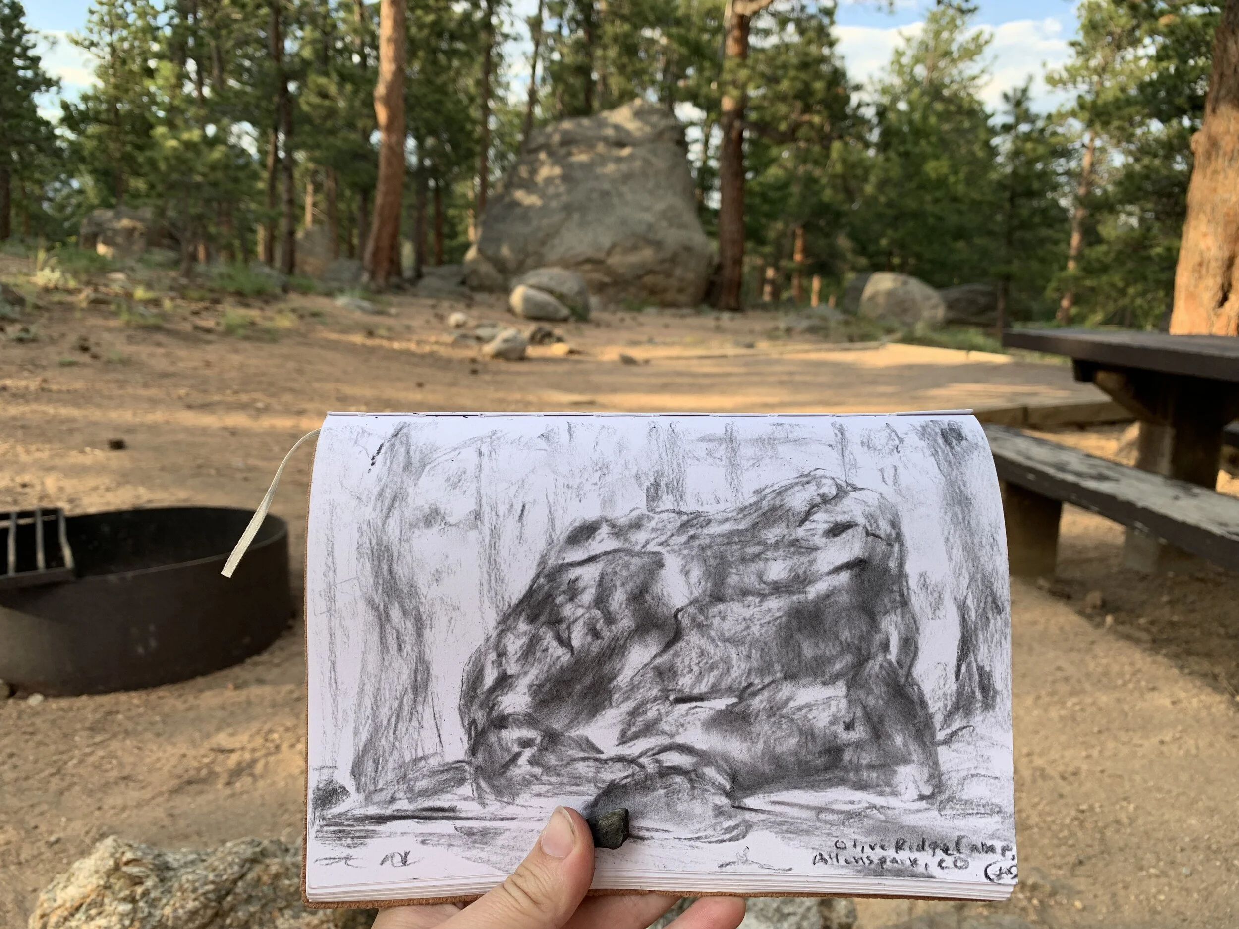 Charcoal from the campfire to draw the nearby boulders at Olive Ridge Campground, Allenspark, CO