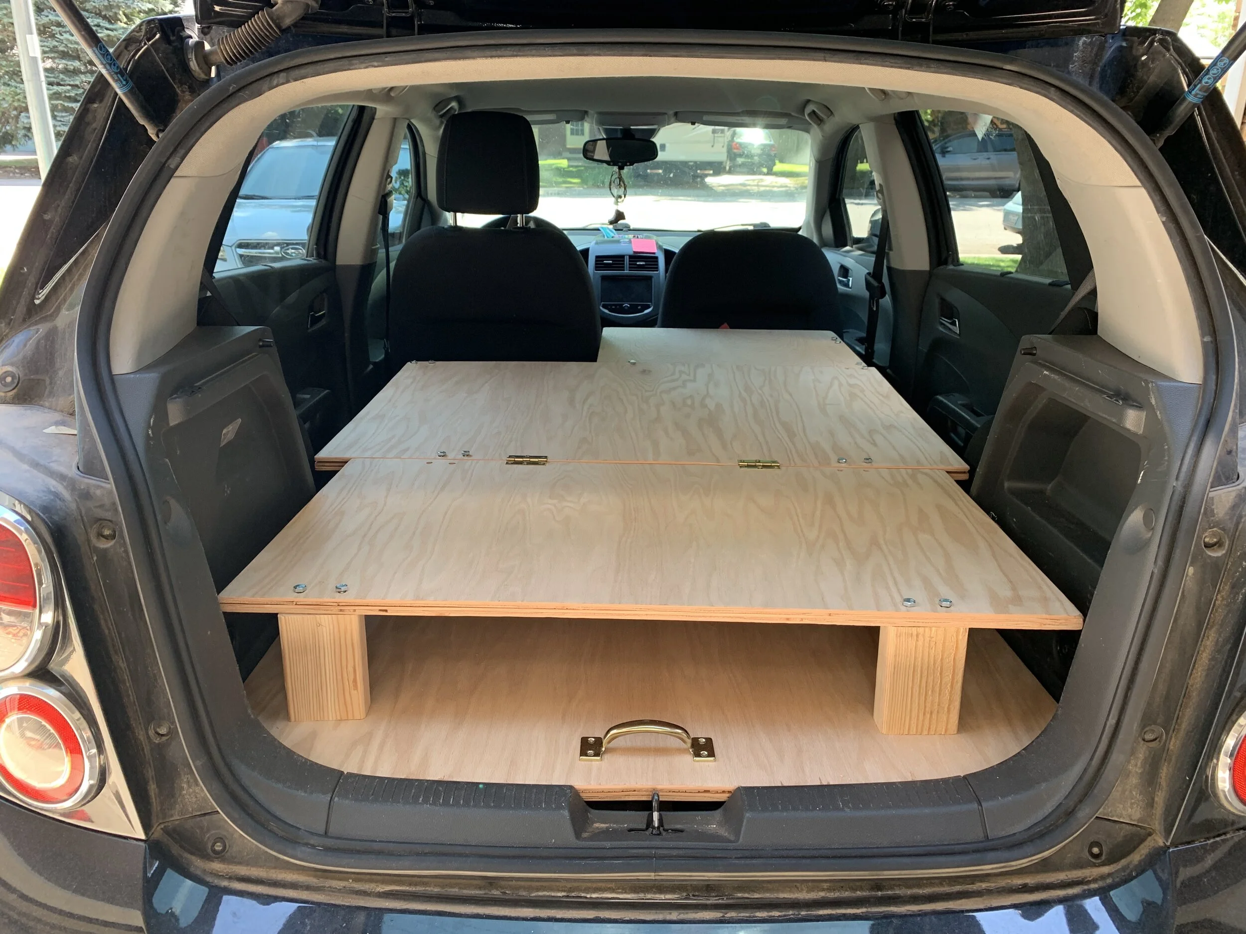 Platform build for car camping! Handle lifts up for art supply storage, and then flat canvases will go in between the shallow space. Back piece is on a hinge to lift up, and all pieces can be easily removed with the drop pins.